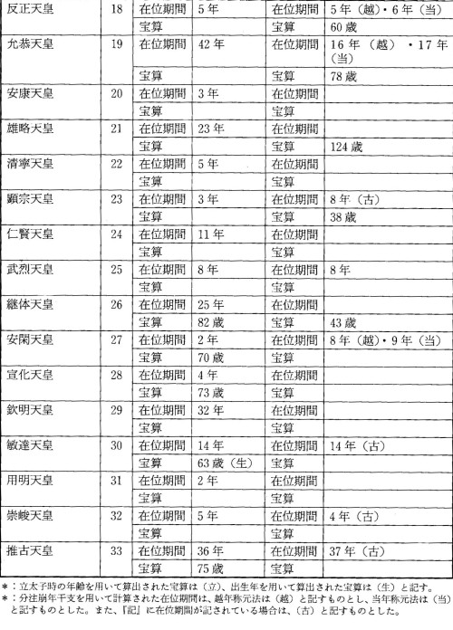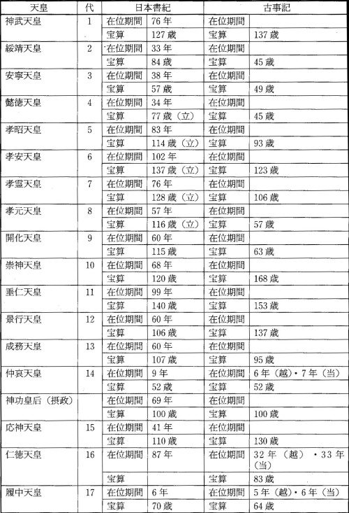 繊緯思想の影響を受けて構想? 紀年論の第3の論点は「非現実的な長期在位や長寿」です。 日本書紀と古事記における歴代天皇の在位期間と享年(宝算)は次のとおりです(36〜37ページ)。 ![]() ![]() 在位期間と享年(宝算)は、客観的基礎データであるにもかかわらず、ごく一部の例外を除いて、日本書紀と古事記では全く異なっています。日 本書紀と古事記の編纂時に帝紀が文書として存在したのであれば、このような著しい食い違いは生じなかったのではないかと思われます。 さらに、日本書紀と古事記においては、仁徳以前は100歳以上の長寿が普通であって、60歳で即位し120歳まで生きた例も珍しくありませ ん。今でこそ100歳以上の長寿も可能となっていますが、それはごく最近のことです。弥生時代や古墳時代では、ありえないデータです。 この点に関して、本書では次のように述べています(17〜18ページ)。