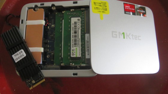 GMKtec NucBox G10は、SSDとメモリーの交換・増設が、すごく容易です(GMKtec NucBox G10 レビュー)。上蓋はツメでひっかけてあるだけなので、簡単に外せます。M.2 スロットは2つあり、512GBのSSDが装着されていて、1つは空いているのでSSDを増設できます。512GBのSSDを外して、新たに購入した128GBのSSDに付け替えました。