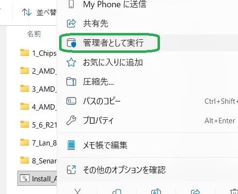 右クリックし、「管理者として実行」(緑枠)をクリックすると、次々とドライバーがインストールされ完了します。